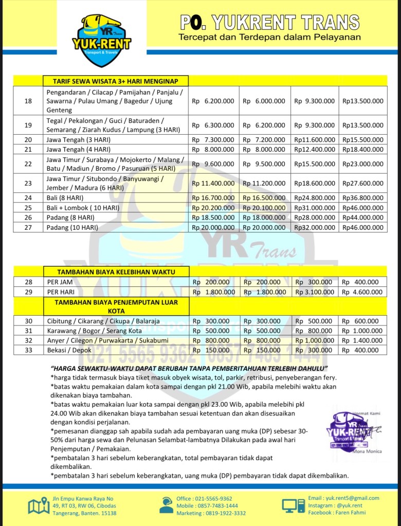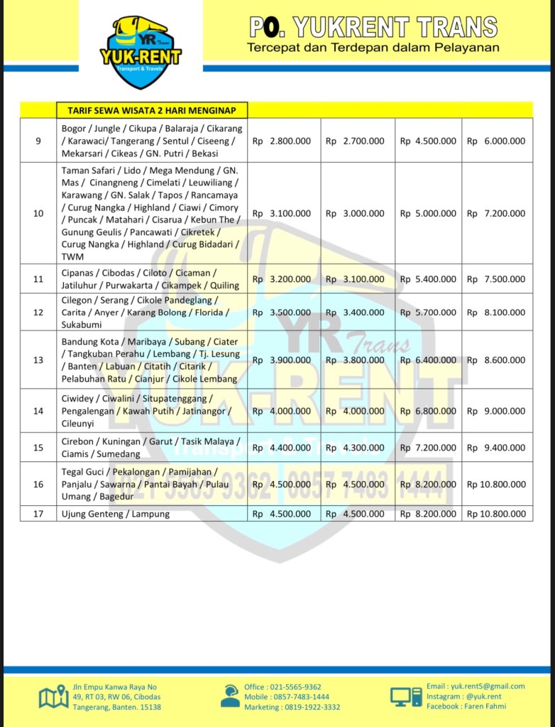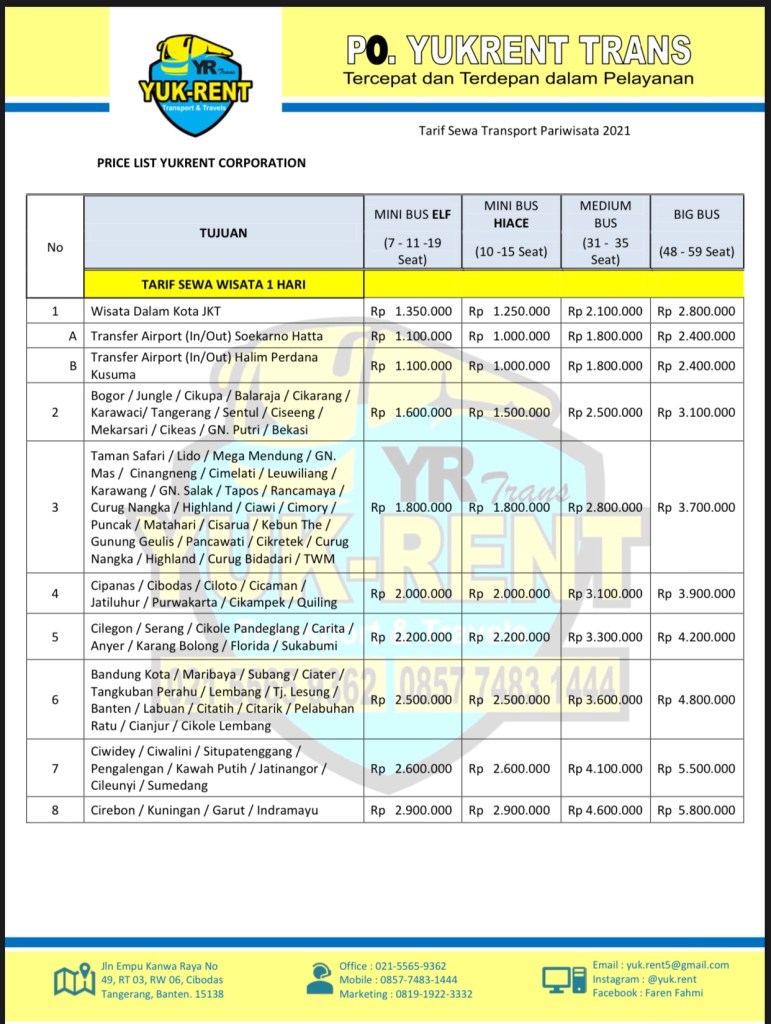 Kami perusahaan jasa Transportasi berbadan usaha PT. YUKRENT MITRA TRANSPORT, menyewakan Armada Penumpang dan Truk Cargo Logistik : Berikut Ketersediaan Armada kami ➧Elf Coaster (19 seat) ➧Hiace Premio dan Commuter (14 seat) ➧Medium Bus (31-35 seat) ➧Big Bus (59 seat) ➧Premio Luxury (9 seat VVIP) ➧CDE Box 3 ton Melayani : Jasa Antar Jemput Karyawan, Angkutan Pariwisata, Private Tour, Carter Kebutuhan Dinas, Drop In/out Bandara Hotel Dll, Ziarah. Jasa Cargo Trucking, Bongkar Muat, Short Trip/Long Trip. 📞 085774831444 (Mobile) ☎️ 021 5565 9362 (Office) 📧 yuk.rent5@gmail.com Tim YUKRENT akan membalas pada jam kerja ; (Senin - Sabtu, 08.00 - 23.00 WIB). FASTEST (Senin - Sabtu, 23.30 - 07.30 WIB). LOWRESP - Katalog Kendaraan, Promo Discount, & Paket Wisata : https://wa.me/c/6285774831444 - Kenapa harus sewa di kami ? https://yuk-rent.com/ Lihat lebih banyak pos